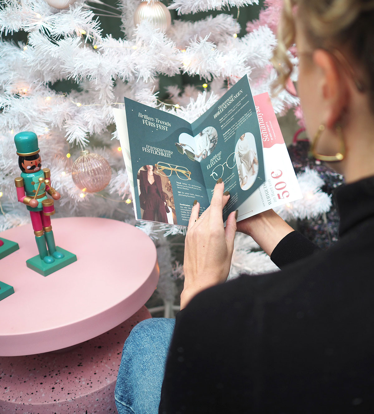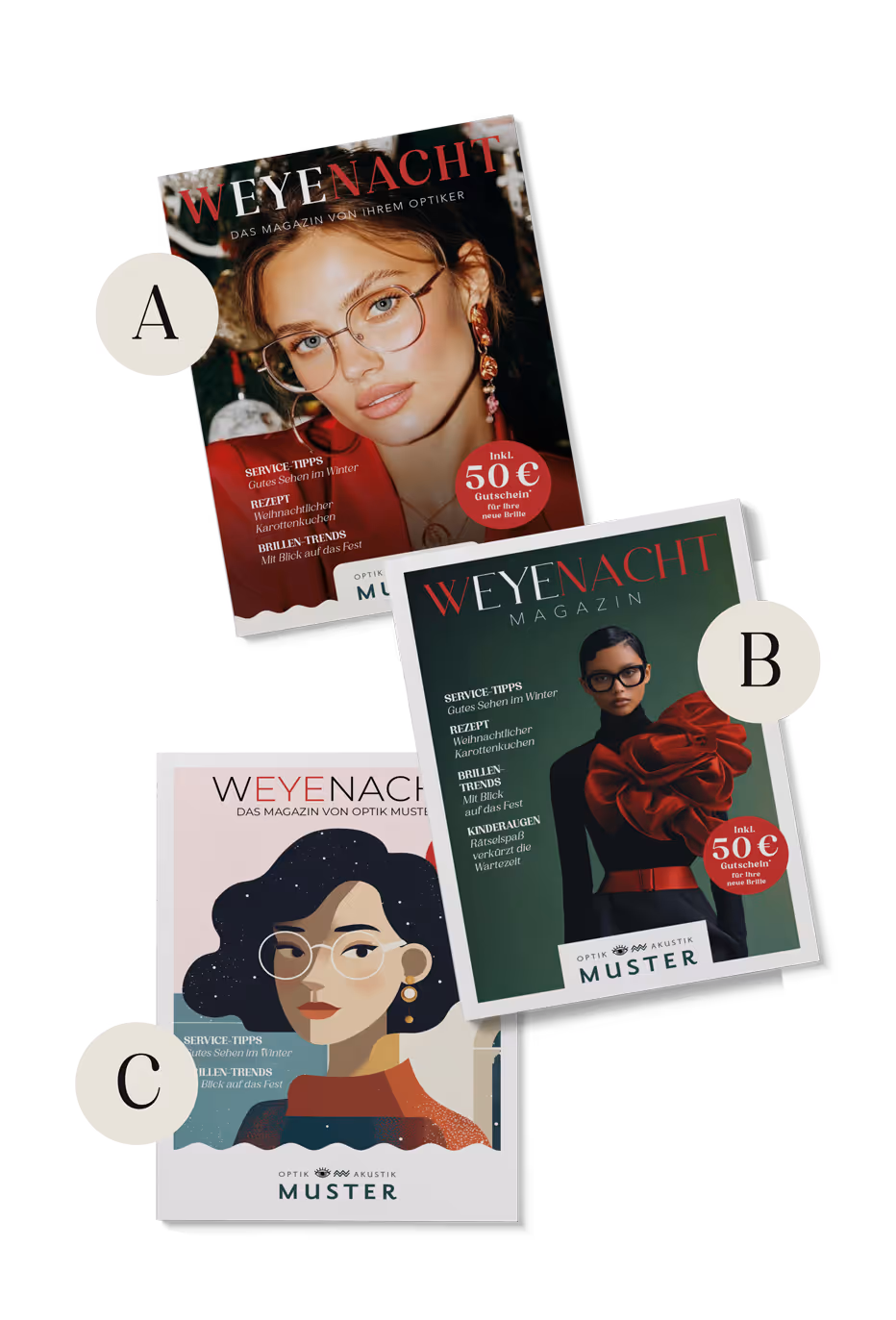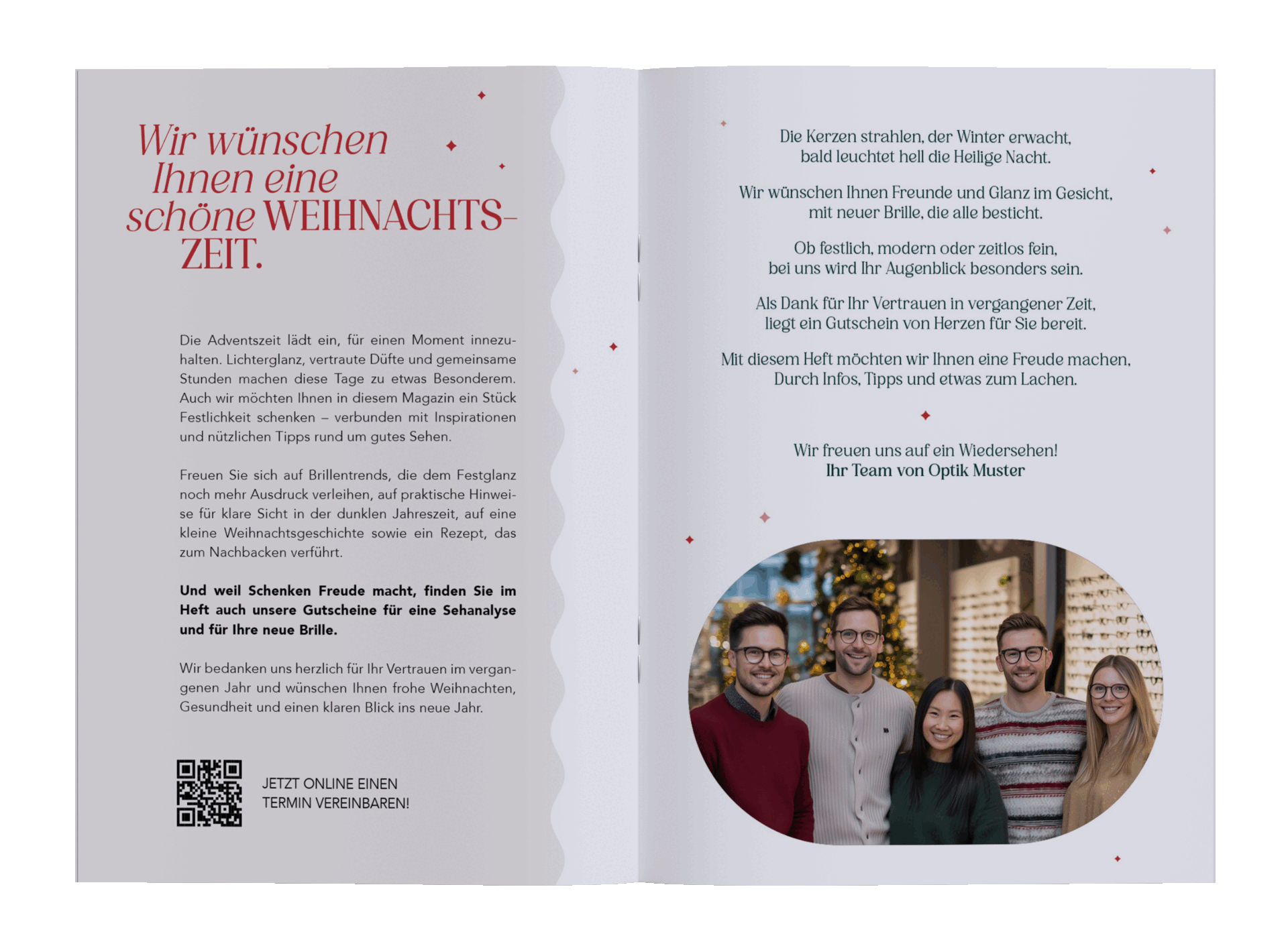 Das Weihnachtsmagazin ist mehr als nur eine Lektüre – es ist Ihre persönliche Grußbotschaft an Ihre Kund:innen. Mit einer individuellen Gestaltung rücken Sie Ihr Geschäft in den Mittelpunkt: ein herzliches Vorwort, Ihr Teamfoto und eine direkte Ansprache machen das Magazin einzigartig und nahbar. Neben Ihrer persönlichen Vorstellung erwarten die Leser abwechslungsreiche Inhalte, die perfekt zur Adventszeit passen: Eine stimmungsvolle Weihnachtsgeschichte, ein leckeres Rezept zum Nachkochen, spannende Tipps rund um Brillen und Augen, aktuelle Mode- und Trendthemen sowie eine Rätselseite für Kinder. Als besonderes Highlight enthält jedes Heft einen heraustrennbaren Gutschein oder ein exklusives Angebot.